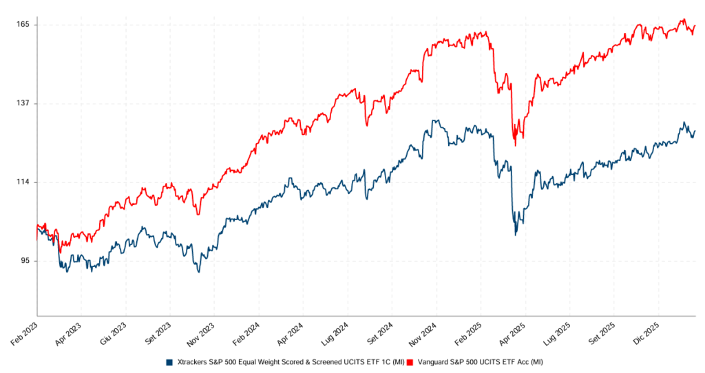 • Metodologia Equal Weight come l’Xtrackers S&P 500 Equal Weight Scored & Screened UCITS ETF 1C (MI)