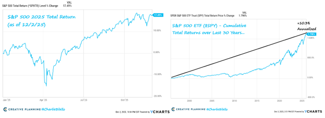 Nella figura di sinistra si nota l’andamento dell’indice nel 2025 e il suo recupero dopo la discesa di Aprile. Nella figura di destra invece riportiamo la crescita dell’indice nella modalità Total Returns negli ultimi 30 anni. La crescita annualizzata è del 10,3% nonostante la bolla delle dot.com del 2000, la crisi di Lehman Brothers e il Covid.