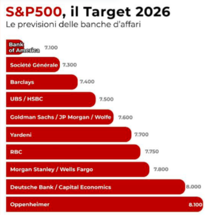 Un secondo elemento riguarda le previsioni delle principali banche d’investimento sull’S&P 500. Le stime attuali convergono su un target medio compreso tra 7.500 e 7.600 punti, delineando uno scenario costruttivo per l’equity americano nel medio termine. Queste indicazioni suggeriscono aspettative di crescita degli utili e di tenuta del ciclo economico, nonostante un contesto macro ancora complesso.