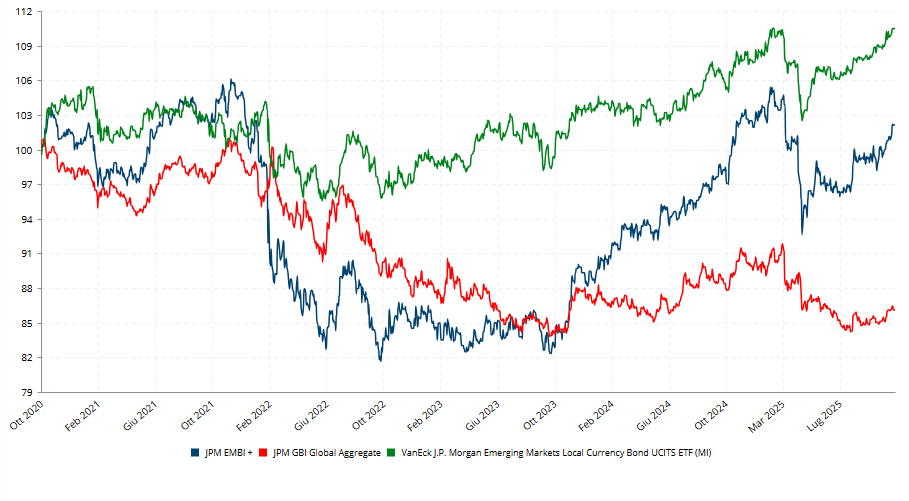 Nel grafico qui sotto vediamo l’andamento negli ultimi 5 anni delle obbligazioni dei paesi sviluppati (rosso), dei paesi emergenti in valuta forte, ovvero USD, (blu) e dei paesi emergenti in valute locali (verde).