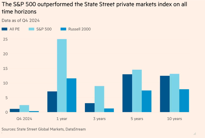 L’apertura a questi strumenti offre nuove opportunità di diversificazione, ma i dati mostrano che, in termini di rendimento, i mercati privati risultano spesso meno convenienti rispetto a quelli quotati. Nel grafico qui sotto vediamo che in nessuno degli orizzonti temporali considerati l’indice dei private equity (blu scuro) ha superato l’S&P 500.