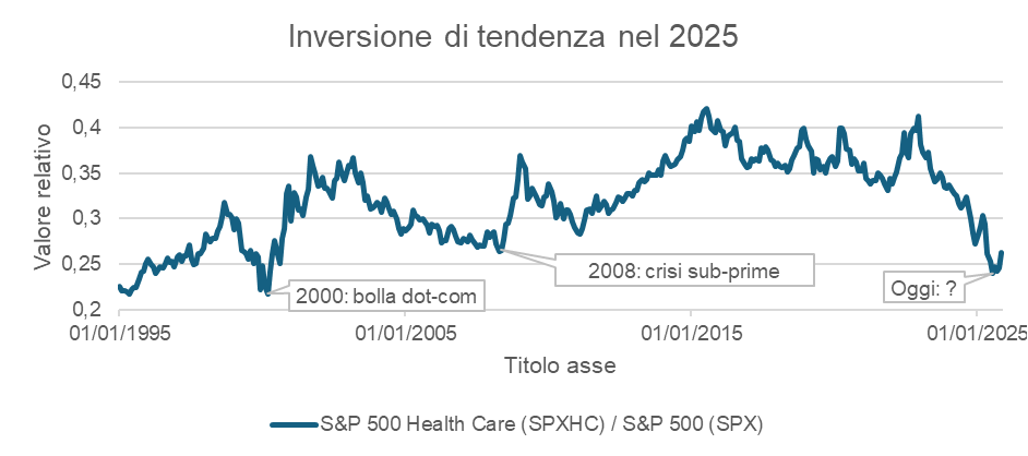 L’Healthcare sta provando a invertire la rotta dopo una delle peggiori fasi relative degli ultimi decenni. Storicamente, movimenti simili si sono verificati quando il mercato più ampio si avvicinava a una fase di transizione del ciclo, con gli investitori che iniziavano a privilegiare settori più difensivi. Nel complesso possiamo quindi considerare questo pattern sia come spunto tattico che come avvertimento ciclico.
